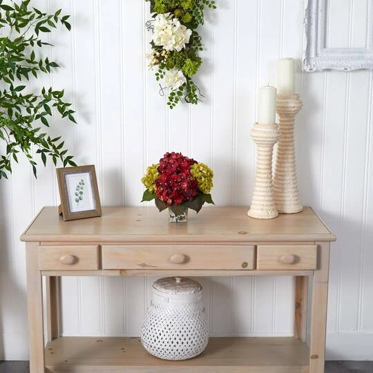 This wonderful green and burgundy hydrangea arrangement is ideal for any place you need something bold and beautiful. With multicolored hydrangea blooms atop big green leaves, it makes for a striking color combination. And as a plus, it never needs care or water, and will stay looking fresh for years. Complete with decorative vase, this piece is ideal for both home and office decorating, and makes a fine gift as well.