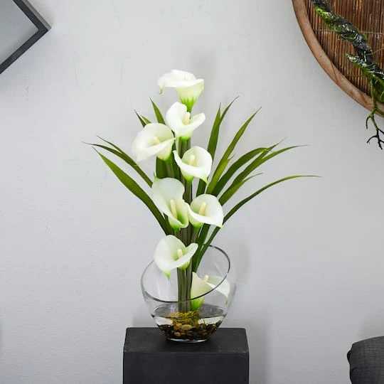 Brilliant hued blooms paint a startlingly contrast against thick green foliage. Majestic in it’s beauty, this calla lily arrangement comes in a modern slanted vase with faux water and river rocks. Put it in any room to add drama and draw the eye.