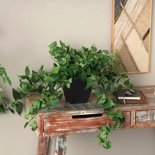 This realistic faux foliage is crafted from durable and lasting plastic and polyester materials to create a versatile décor piece. An artificial plant décor that showcases natural green faux foliage, nestled in a black plastic pot. This droopy artificial plant highlights a life-like appearance to add a fresh pop of color and a natural element the home, without the need for watering or maintenance.