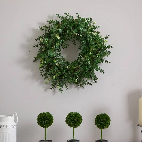 If one is looking for the ideal wreath to hang, this eucalyptus double ring wreath is just the piece for any room. Luxurious green leaves highlight this arrangement, while being dotted with lovely white flora throughout the wreath. Creating a peaceful yet cheerful atmosphere, this wreath will look perfect in any setting or room, no matter what time of year it is.