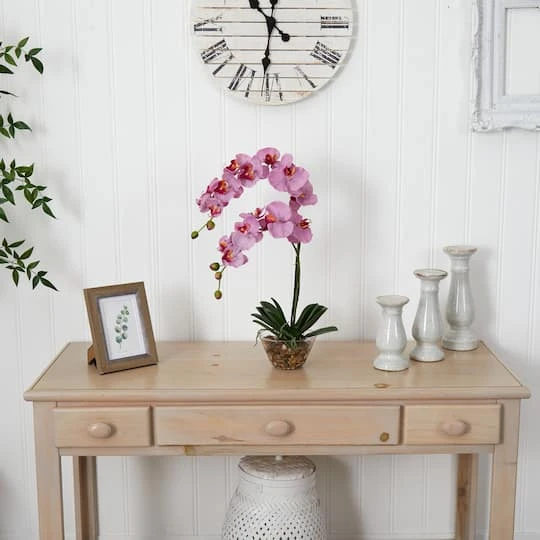 Standing 18″ inches high, this grand member of the orchid family is sure to make a spectacular impression. A mix of brightly hued petals graced by two delicate buds adds a simple yet elegant touch. Perfect for a dining room centerpiece, this attractive Moth Orchid arrangement is adorned by lush green leaves. A delicate round glass vase adds the perfect finishing touch to this floral masterpiece.