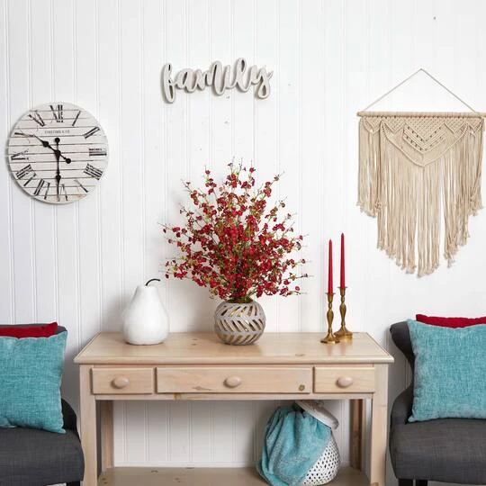 Incorporate hints of the countryside throughout your home with this cheerful, artificial arrangement flaunting a delicate collection of cherry blossom sprays, each made up of intricate silk flowers in bright, fresh color and enhanced with complementary greenery. Standing 30″ high from a gold trimmed stoneware vase, this effortless arrangement would easily beautify a bedroom or bathroom.