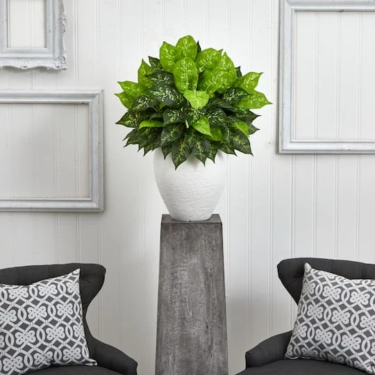 With it’s leaves that come in various shades of green, the dumb cane artificial plant’s variegated foliage paints a stunning presentation. Paired with it’s pure white oval vase, it’ll both brighten and open up a secluded dining room. You can also place it at the end of your kitchen bar for some added greenery. This item will need to be re-shaped when removed from the secure box to allow it to reach its fullest size. Your artificial plant will look beautiful for years to come; simply wipe clean with a soft dry cloth when needed.Â