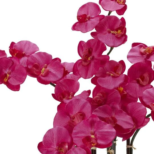 This 31″ high moth orchid resembles a miniature tree thus enhancing its already delicate look. Set atop a bed of green and a tasteful island inspired vase, this delicate looking flower lasts forever with no watering ever!