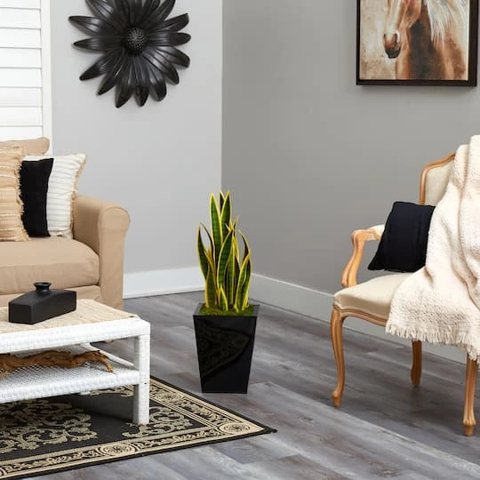 Filled with intricate detailing on the sword-like, thick leaves, this realistic faux snake plant brings vertical appeal to any space with the yellowish hued tips. While eliminating the fear of overwatering, this fake plant looks fresh year-round. Standing 31 inches tall from a black metal planter (included in height), this arrangement fits perfectly in compact spaces. Well suited for a bathroom, lonely corner, or apartment.