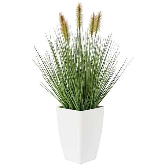 Made from high-quality plastic, this artificial plant offers both durability and a realistic appearance, mimicking the texture and color of natural foliage. Contemporary artificial plant décor features green and yellow grass with a matte white pot. Stylish faux plant showcases a realistic design that brings a touch of naturalistic greenery to your interior without the added hassle of maintenance.