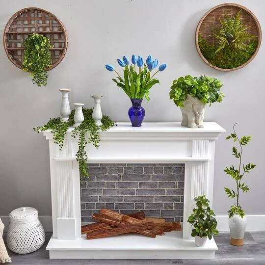 A symbol of spring, you can now enjoy the tulip’s warmth all year long with this Dutch tulip artificial floral arrangement. A bunch of tulip flowers not yet in bloom are accented by green leaves to bring texture, drama and color to spaces in need of a spring awakening. Experience the fresh from the garden feel every season effortlessly without the need for maintenance. Standing 22″ from a blue vase, this arrangement makes a great gift. Perfect for offices, mantels, kitchens, bedrooms or kitchen nooks. Silk arrangements are manufactured using synthetic materials, such as polyester material or plastic, and are well designed and constructed to be life-like in appearance.