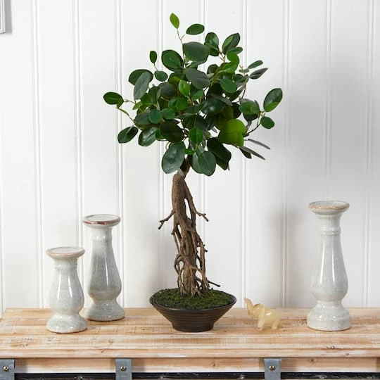 Love the Ficus? Bring it to your desktops with this Ficus bonsai artificial tree. If youft.ve wanted the airy yet full look of the Ficus in a mini version, you canft.t go wrong with this choice. Crafted from high-quality materials, brighten any space in need of some color and charm. Best of all? Zero maintenance! Standing 2ft. from a decorative planter (included in height), with faux moss, house in any desktop. Perfect for a desk, mantel, night stand and makes a great gift. Artificial trees are manufactured using synthetic materials, such as polyester material or plastic, and are well designed and constructed to be life-like in appearance. This item will need to be re-shaped when removed from the secure box to allow it to reach its fullest size. Your artificial tree will look beautiful for years to come; simply wipe clean with a soft dry cloth when needed.