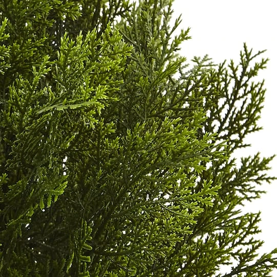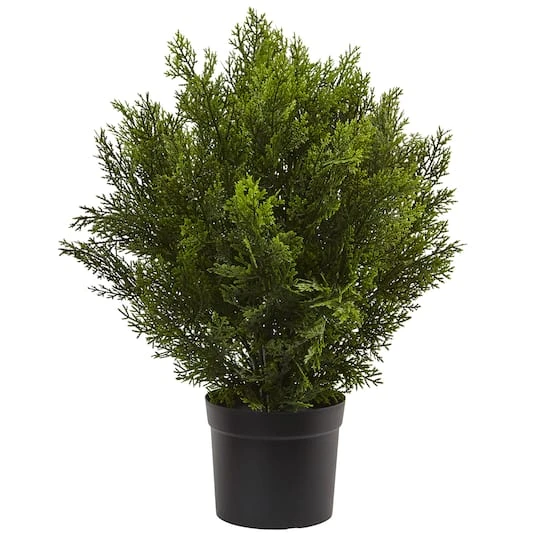 Adorned with intricate stems, this lush cedar bush is the perfect background foliage for a fireplace floor arrangement or mudroom accent piece. Lifelike, detailed cedar leaves are arranged with adjustable stems. Place with holiday accessories or springtime figurines for year-round seasonal décor. Bush comes with round, black plastic pot.