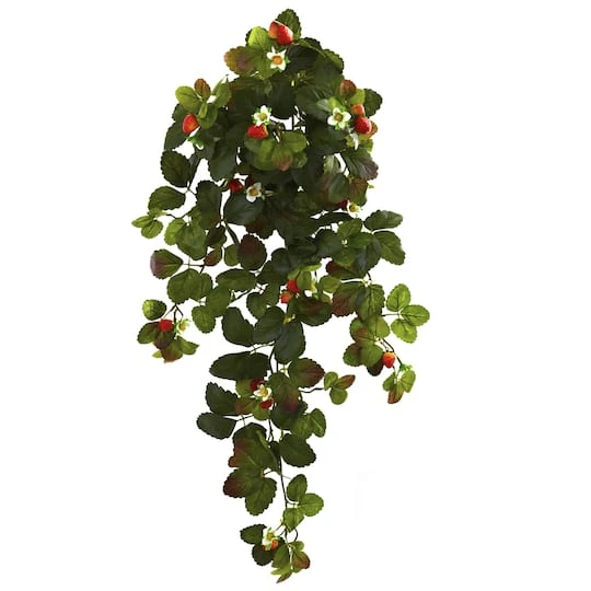 Rich, red strawberries are interwoven with green leaves for a delicious hanging bush. Dainty cream flowers are spread throughout for a full, blooming look.