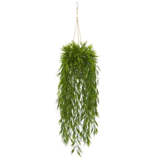 Maximize your vertical space with this Mini Bamboo Plant in Metal Hanging Planter. It boasts a wild and unruly overgrowth of thin-bladed leaves cascading down like an evergreen waterfall. Adding texture and dimension wherever displayed, this mini bamboo plant reaches 4ft. long from a hanging metal bucket. Requires absolutely no maintenance or upkeep. Measurements are from the bottom of the pot to the furthest extended leaf or branch.