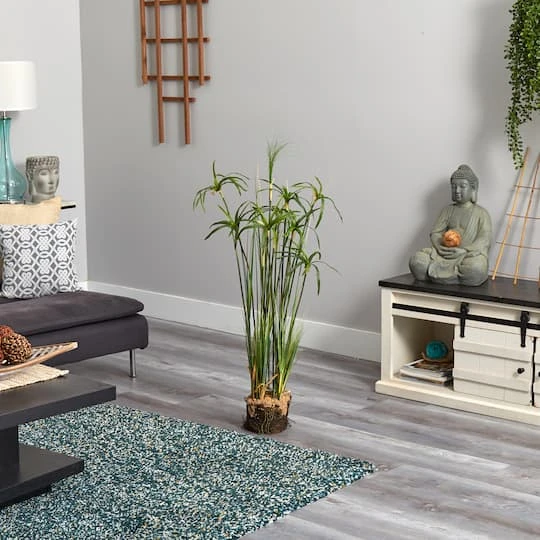 Standing a tall four feet, this faux papyrus plant features alternating stalks of greenery for added depth and dimension. Vibrant green hues mix with a faux dirt base for a realistic look. Place this stately plant in a glass vase or colorful urn to add height in a decorative display.