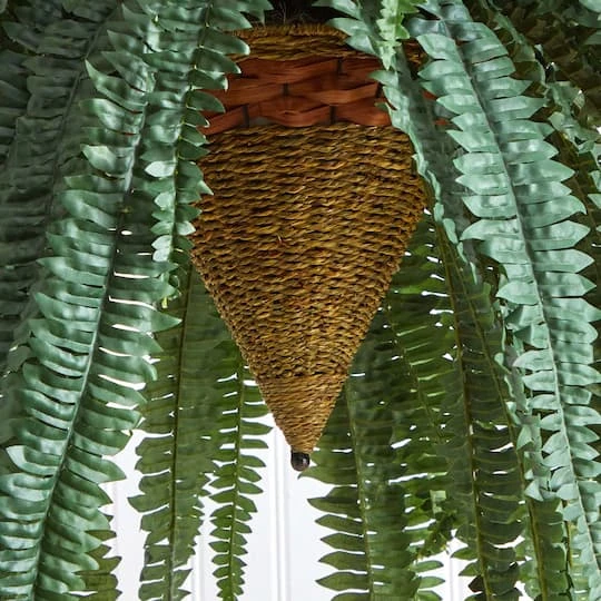 A forest favorite, this artificial giant boston fern can easily change a room. Boasting realistic looking fronds that pour forth from a hanging cone, this brightly colored plant adds instant freshness to its environment. Reaching 50” long, it makes for a grand statement wherever displayed.
