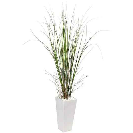 The tall stalks of bamboo grass stretch out from the white ceramic tower planter and included river rock. This vertical arrangement can add drama when placed near an entryway, or it can make an otherwise bare corner something interesting. Made from the finest materials, the bamboo grass looks realistic and natural and will for years to come.