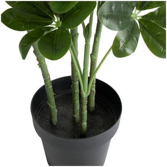 This artificial floor plant is made from a combination of plastic, iron, and cement materials to create a realistic design. It features green leaves and branches and is anchored in a matte black pot.