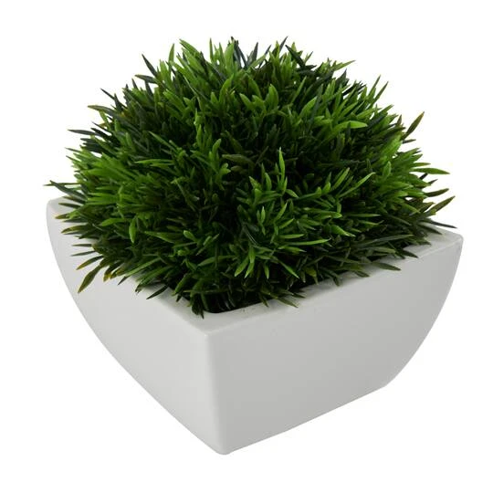 This artificial tabletop plant is made from a combination of plastic and ceramic materials to create a realistic design. Contemporary artificial plant décor features green grass with a matte white pot. Stylish faux plant showcases a realistic design that brings a touch of naturalistic greenery to your interior without the added hassle of maintenance.