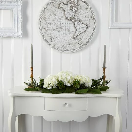 Set the table during the season with this Hydrangea and Eucalyptus Artificial Arrangement. Spread seasonal cheer with this Easter arrangement that you can easily spread in the dining room for a chic picture. The Hydrangea faux flowers bring color while the Eucalyptus brings texture. At 25″Â wide, place this arrangement in any space that needs some color.