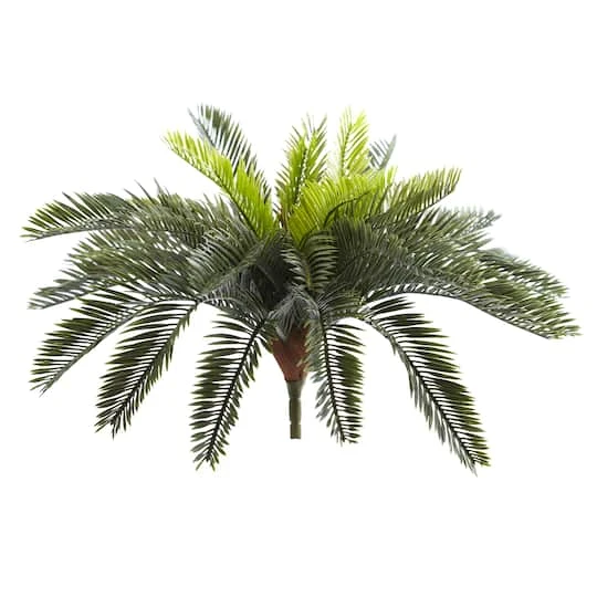 The Cycas plant is made up of single stem that opens to reveal several feather-like fronds. The longer green fronds sit at the bottom, extending outward and draping slightly downward. The shorter green fronds are lighter in color and sit at the top, extending upward. Small and compact, it’ll fit nicely in tight or narrow spaces, like a office desk, dresser, or built-in wall shelf.