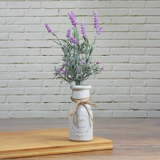 Don’t let your brown thumb hold you back. Show off your love of plants with this beautiful, intriguing artificial lavender. Encased in a white glass milk bottle, greens and purples set in brown pebbles will add rich color to your décor and give the room a charismatic look. Easily maintained, this artificial flora is perfect for your home or office.