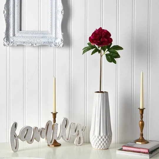 Fancy a fresh from the garden feel? Display beauty all year long with this hand-crafted feminine peony artificial flower bouquet. The white peonies in bloom, create a textured medley of foliage that is contrasted by red flower petals. Stemming 20”, seek the attention of all who lay eyes on her and have fun in your next DIY session. Comes in a set of 3 flowers. Your stems will look beautiful for years to come; simply wipe clean with a soft dry cloth when needed.